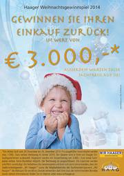 Einmal im Jahr dürfen der Stadtmarketingverein „Wir Haager“ und die Haager Wirtschaft Christkind spielen: Mit etwas Glück können Einkäufe, die zwischen 29. November und 24. Dezember 2014 in Haag bei den am Weihnachtsgewinnspiel teilnehmenden Betrieben getätigt werden, in Form von Haager Einkaufsgutscheinen zurück gewonnen werden. Pro abgegebener Gewinnkarte werden maximal 1.000 Euro verlost, insgesamt werden 3.000 Euro ausgespielt. Zudem verlost das „Wir Haager!“ Christkind auch noch tolle Sachpreise an die treuen Kunden der Haager Wirtschaft. Die Gewinnkarten sind bei den teilnehmenden Unternehmen erhältlich.