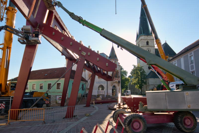 Einige Tonnen Holz und Stahl müssen bewegt werden, um das vielfach prämierte und ausgezeichnete Bauwerk jedes Jahr neu entstehen zu lassen. Nicht unerheblich dabei ist gutes Wetter, denn das in den ersten zwei Tagen aufzustellende Grundgerüst muss mit Hilfe von großen Kranwagen installiert werden! Ein scheinbar ungeordnetes Chaos regiert am Hauptplatz, aber es hat alles seinen Zweck. Natürlich gibt es auch Fotos vom Aufbau zu sehen.